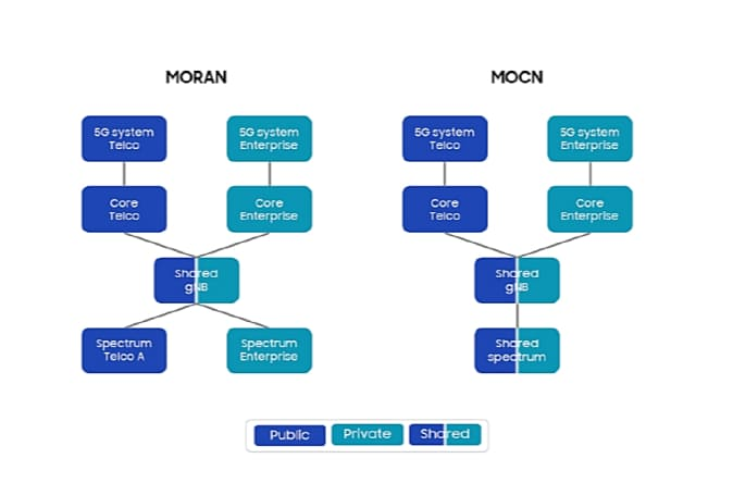 Para compartilhamento de RAN, as duas soluções mais usadas são conhecidas como MOCN (Multi Operator Core Network) e MORAN (Multi Operator RAN):