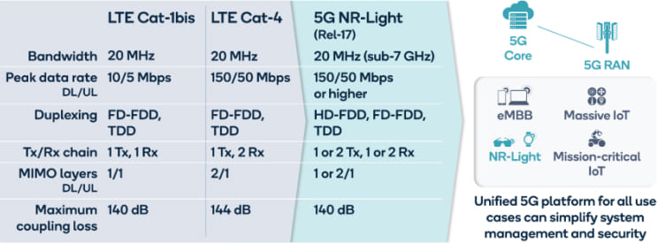 O 3GPP especificou no Release 17 uma versão leve do padrão 5G chamado 5G Reduced Capability (RedCap) para atender às necessidades de baixo custo e complexidade. O 5G RedCap dará aos fornecedores de hardware uma opção viável para desenvolver dispositivos 5G IoT que possam competir com seus equivalentes 4G em preço. Os dispositivos RedCap podem suportar 150 Mbps / 50 Mbps no downlink / uplink.